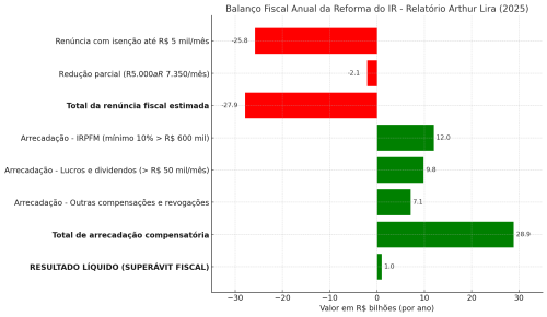 A ampliação da faixa de isenção representa uma renúncia fiscal de R$ 27,9 bilhões por ano, segundo estimativa oficial. Para cumprir a meta de neutralidade fiscal, o projeto propõe três frentes de compensação: